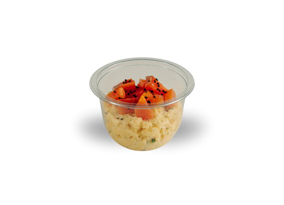SCRAMBLED EGG (EGG, reconstituted skimmed MILK, LACTOSE and MILK PROTEIN, modified starch, salt, citric acid, xanthan gum) 72.85%, smoked salmon TROUT (TROUT, salt, ascorbic acid, sodium lactate, sodium acetate) 16.56%, onion vinaigrette (potato, rapeseed oil, onions, red wine vinegar (SULFITE), CELERY, salt), black SESAME, dill, chives. May contain traces of gluten, nuts, crustacean, egg, fish, mustard, milk, peanut and soy