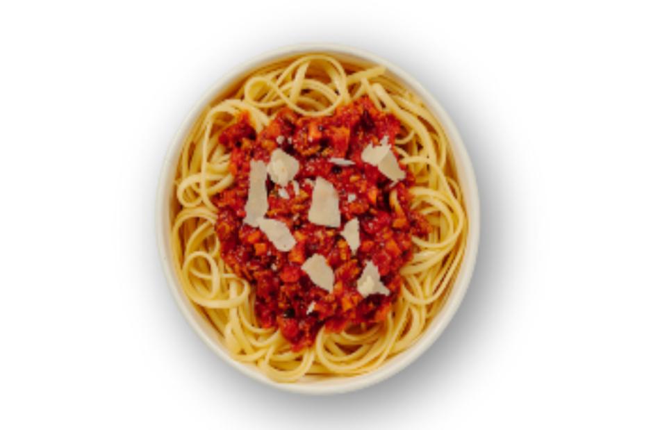 Linguine-Nudeln (WEIZEN) 54,8 % Rapsöl, vegane Bolognese-Sauce 42 % (Tomatenmark, veganes Hackfleisch (Wasser, texturiertes Erbsenprotein, Rapsöl, Aroma, Stärke, Dextrose, gebrannter Zucker, Zwiebeln, Gewürze), Karotte, Basilikum, Oregano, Salz, Knoblauch, schwarzer Pfeffer, braune Mehlschwitze)), Parmesankäse (MILCH, Salz, tierisches Lab, EI-Lysozym) 4,2 %. Kann Spuren von Sesam, Nüssen, Krebstieren, Fisch, Senf, Sellerie, Erdnüssen, Soja und Sulfiten enthalten