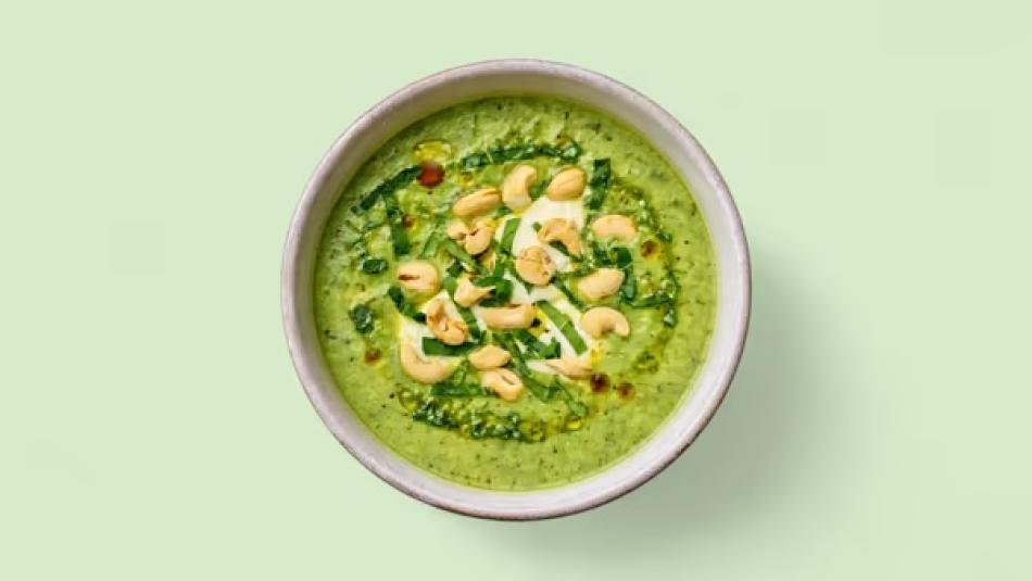 Zucchini soup with fresh goat cheese, cashews, and basil – gluten-free. For the perfect serving temperature, we recommend heating the soup in the microwave for 2–3 minutes.