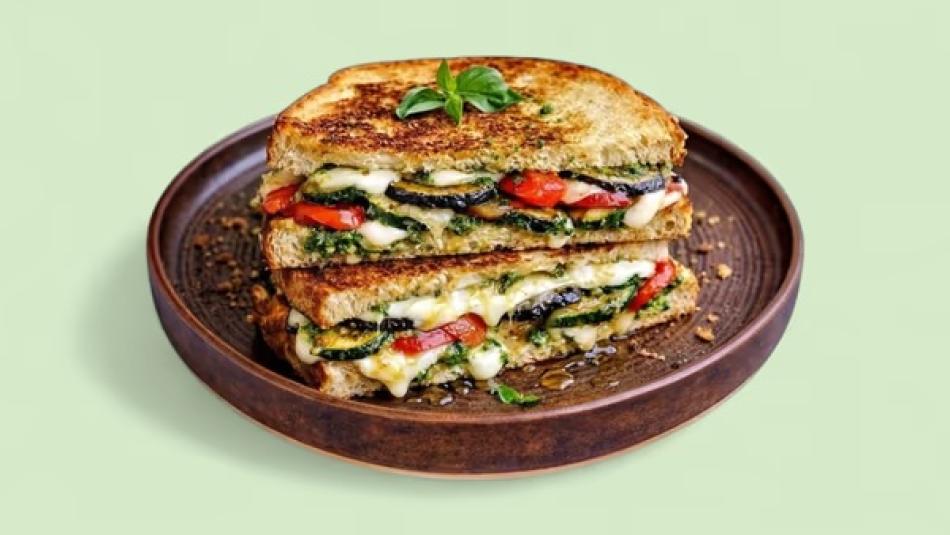 Warmes Sandwich mit gegrilltem Gemüse, Pesto und Mozzarella.