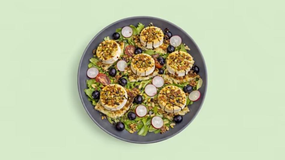 Frischer Salat mit Kirschtomaten, schwarzen Trauben, warmem Ziegenkäse mit Honig und Balsamico-Vinaigrette