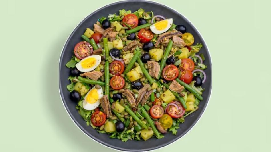 Grüner Salat, Kartoffeln, grüne Bohnen, Tomaten, Ei, schwarze Oliven, Thunfisch, Sardellen, rote Zwiebeln