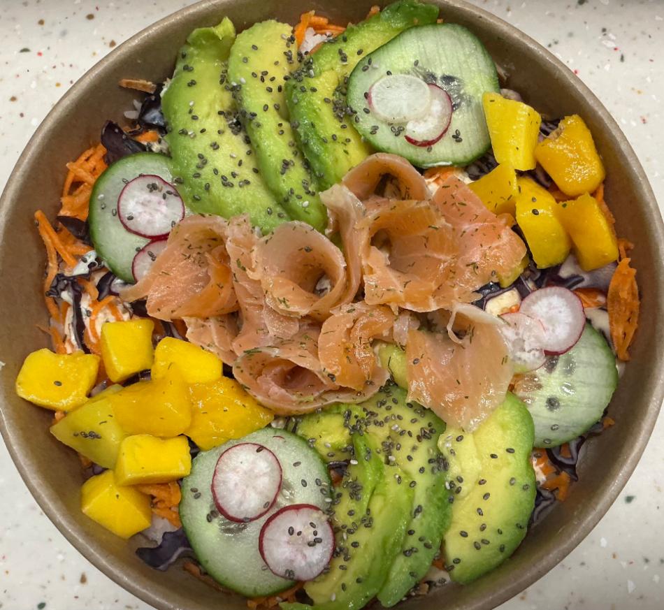 Duftreis, griechische Joghurtsauce, Karotten, Rotkohl, Gurken, Radieschen, Avocado, Chiasamen, marinierter Räucherlachs, Poke-Sauce, Mango.
