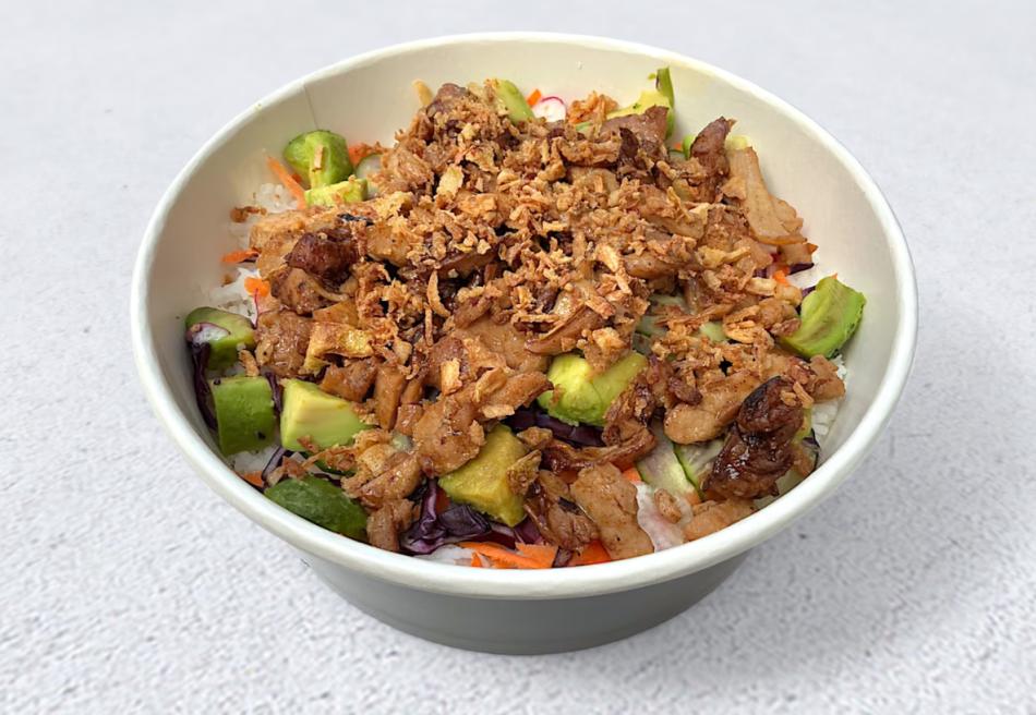 Riz parfumé, sauce maison aigre douce, carotte, choux rouge, concombre, radis, avocat,