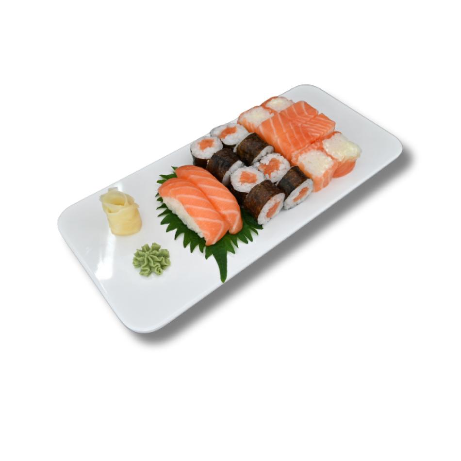 2 Stück Lachs-Nigiri, 8 Stück Lachs-Maki, 8 Stück Lachs-Rolle