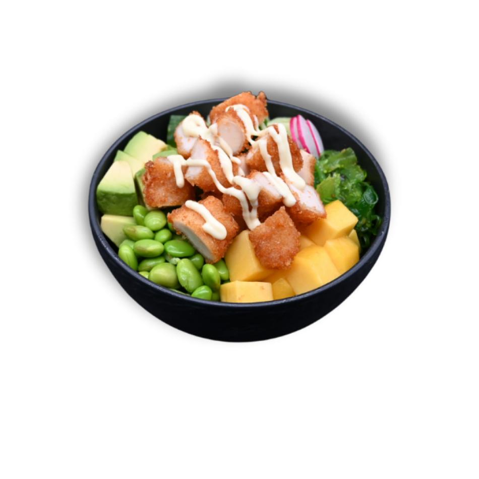 Gebratene Hähnchenstücke, Avocadowürfel, Edamame-Bohnen, Mangowürfel, Algensalat, Gurke