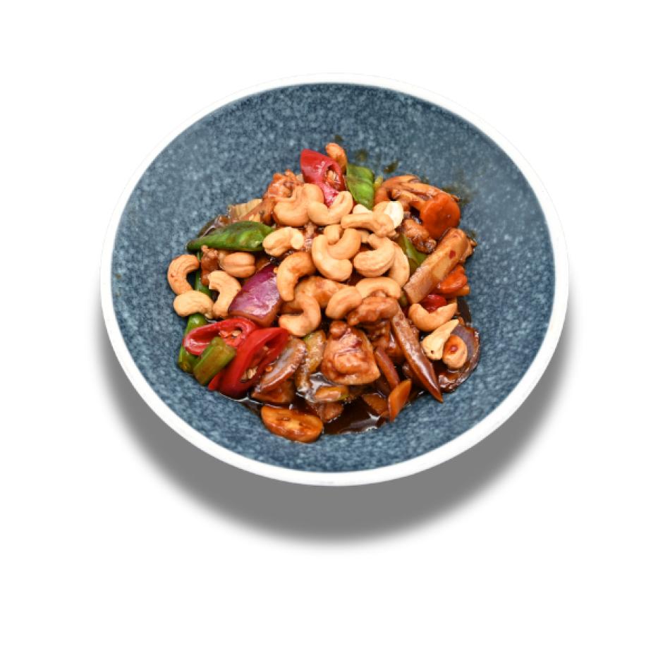 Knusprige Hähnchenhaut, Cashewnüsse, rote und grüne Paprika, Karotten, Bambussprossen, Champignons, Chinakohl