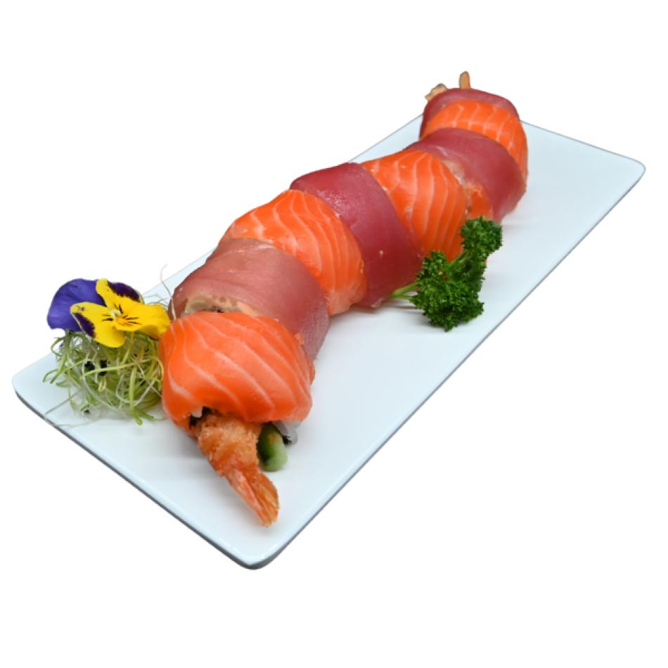 Sushi-Reis, Nori-Garnelen-Tempura, Avocado, Gurke, Lachsscheiben, Thunfischscheiben
