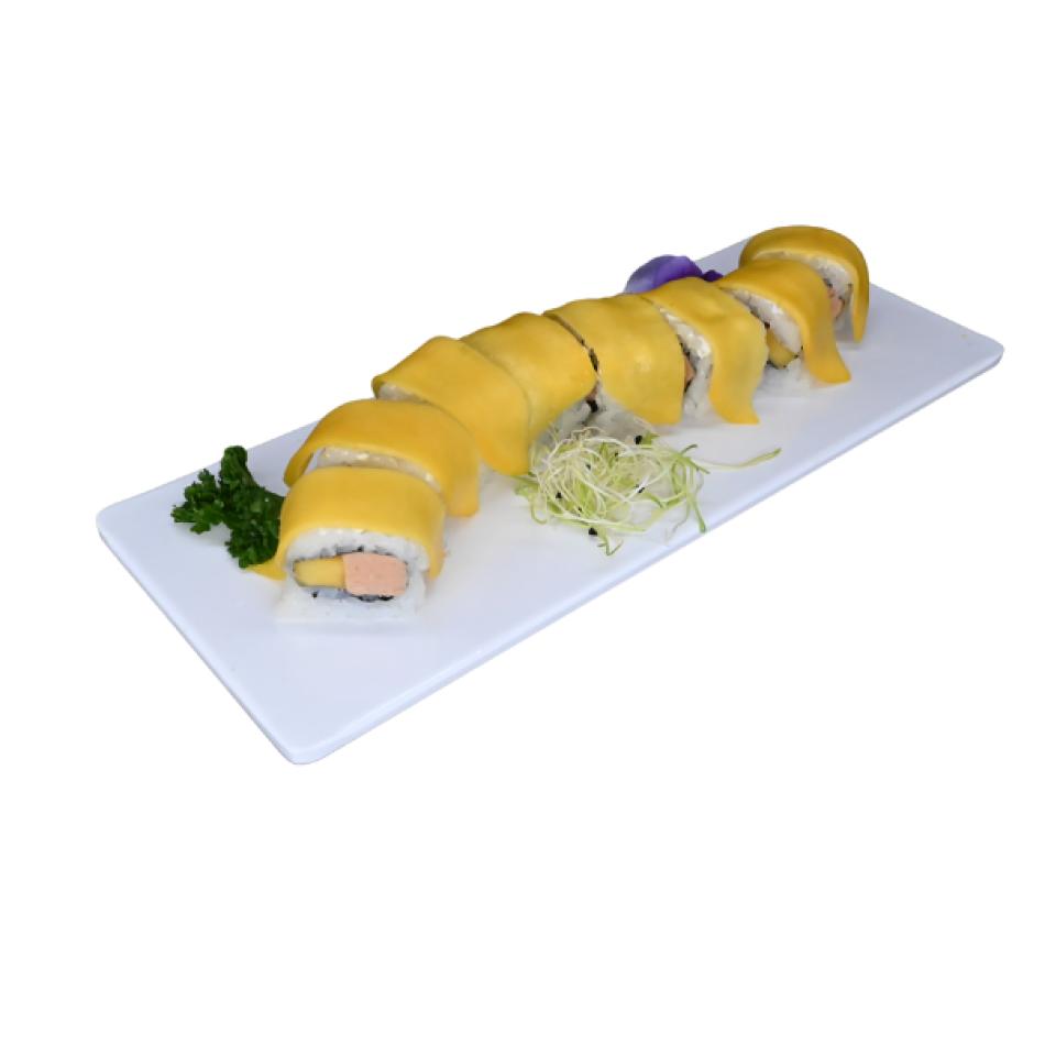 Sushi-Reis, Nori, Foie gras, Avocado, Gurke, Mangoscheiben obendrauf