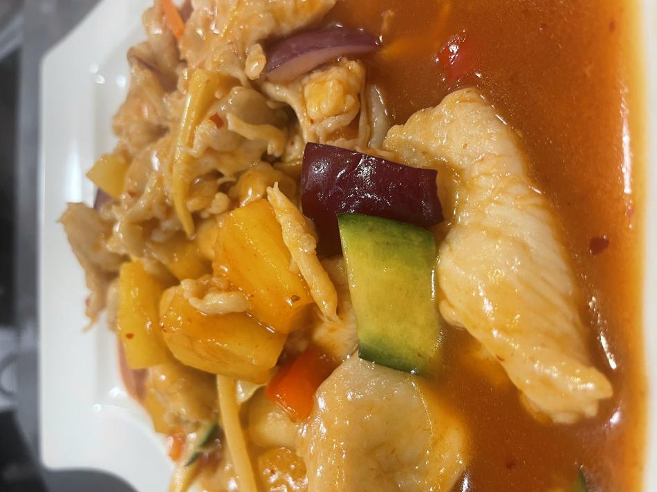 Ananas, Paprika, Zwiebeln, Lauch, Bambus, Zucchini, Karotten, Sambal, leicht scharf