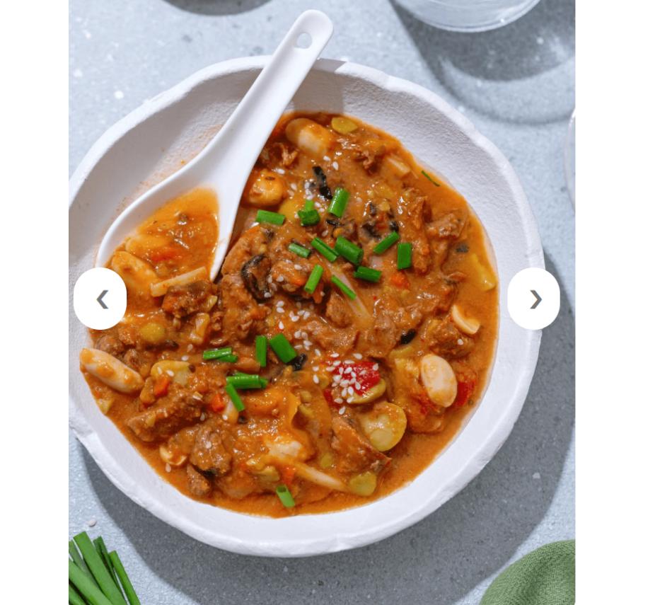 Trinkwasser, Rindfleisch 31 %, Paprika 9 %, Fava-Bohnen, Zwiebeln, Bambussprossen, Erdnüsse, Karotten, Tomatenmark, Maisstärke, Mu Err Pilze, Speisesalz, Sonnenblumenöl, Branntweinessig, Rapsöl, Chili, Zitronengras, Knoblauch, Schalotten, Kaffirlimettenschale, Gewürze, Kräuter.