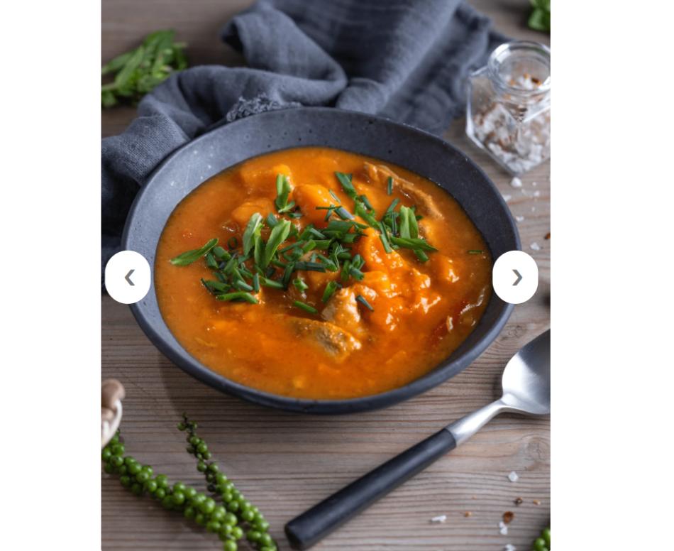 Drinking water, chicken strips 19% (chicken breast fillet 94%, rapeseed oil, table salt), sweet potatoes 16%, bell pepper 4%, pineapple juice concentrate, mung bean sprouts 3% (contains acidifier: citric acid), carrots 3%, rapeseed oil, tomato paste, onions, corn starch, ginger, spirit vinegar, lemongrass, lemon juice, table salt, sunflower oil, garlic, spices (contain mustard), herbs.