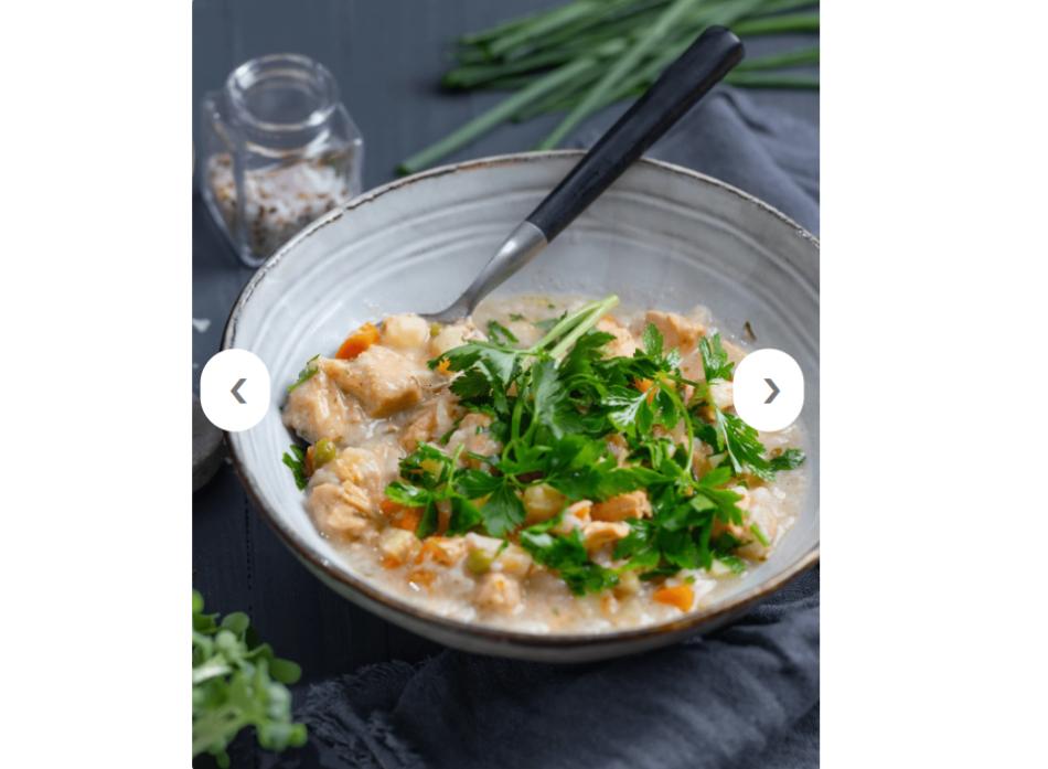 Drinking water, pre-cooked chicken meat 18%, potatoes 13%, carrots 12%, low-fat milk, lactose-free yogurt (yogurt, lactase), green peas 2%, onions, rapeseed oil, corn starch, sea salt, lemon juice, sunflower oil, spices, herbs.