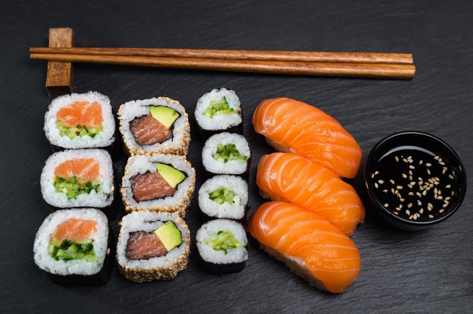 2x große Maki Lachs-Avocado, 2x große Maki Lachs-Gurke,