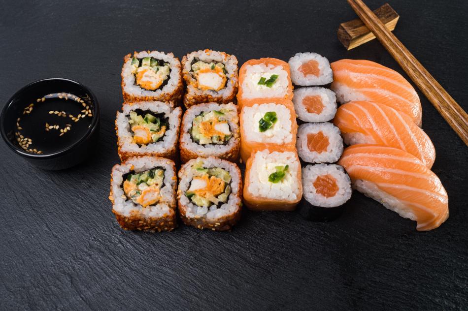 4x California Spicy Chicken, 4x Lachs-Käse Maki, 2x Lachs Nigiri.
