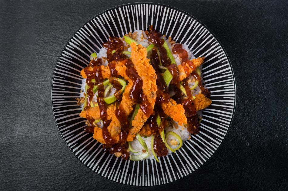 Reis mit Reisessig, Hähnchen, Yakiniku-Soße, Lauch, knusprige Zwiebeln.