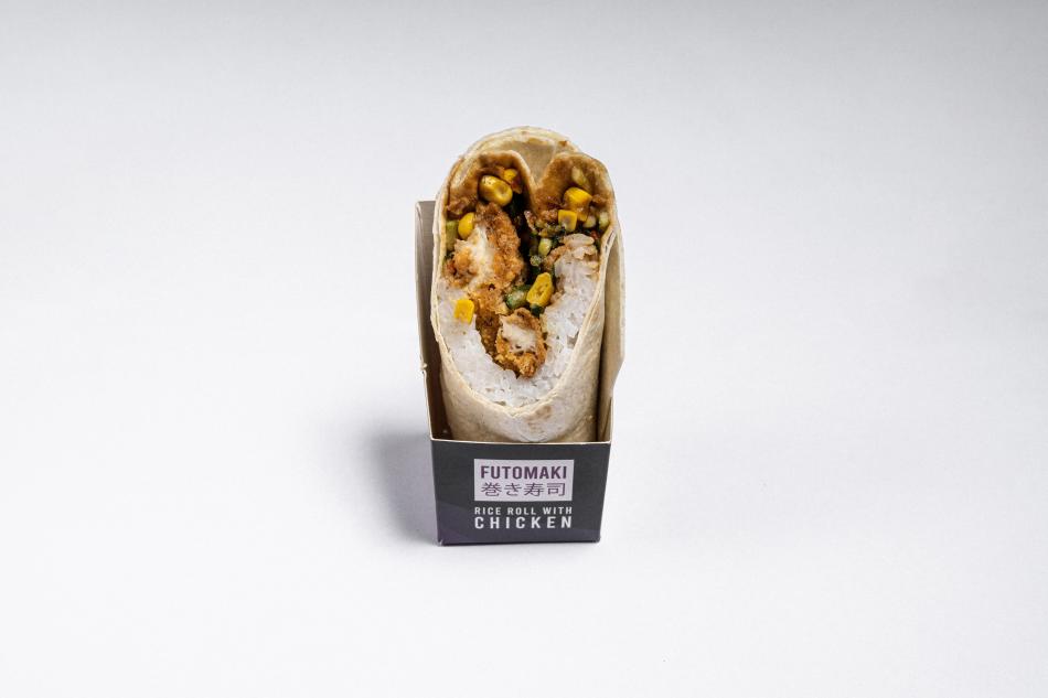 Rote-Bete-Wrap, Reis mit Reisessig, Hähnchen, Aal-Soße, Gurke, Paprika, Mais, knusprige Zwiebeln.