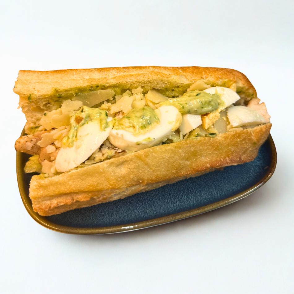 Baguette bread, marinated and grilled chicken breast, pesto mayonnaise sauce, iceberg lettuce, Parmesan cheese, hard-boiled egg