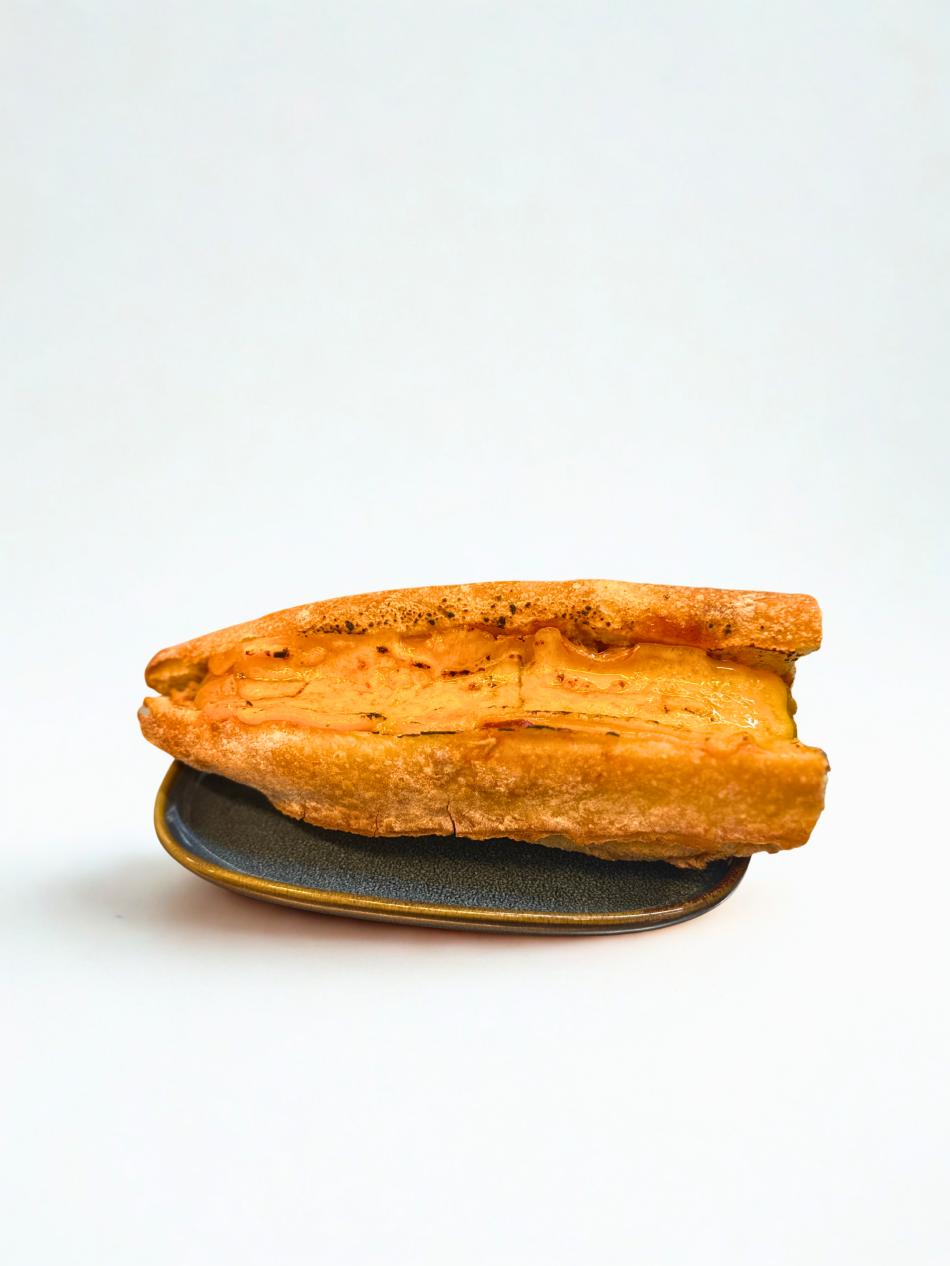 Baguettebrot, Pulled Pork, BBQ-Sauce, Gewürzgurken, in Scheiben geschnittene rote Zwiebeln, geschmolzener Cheddar-Käse