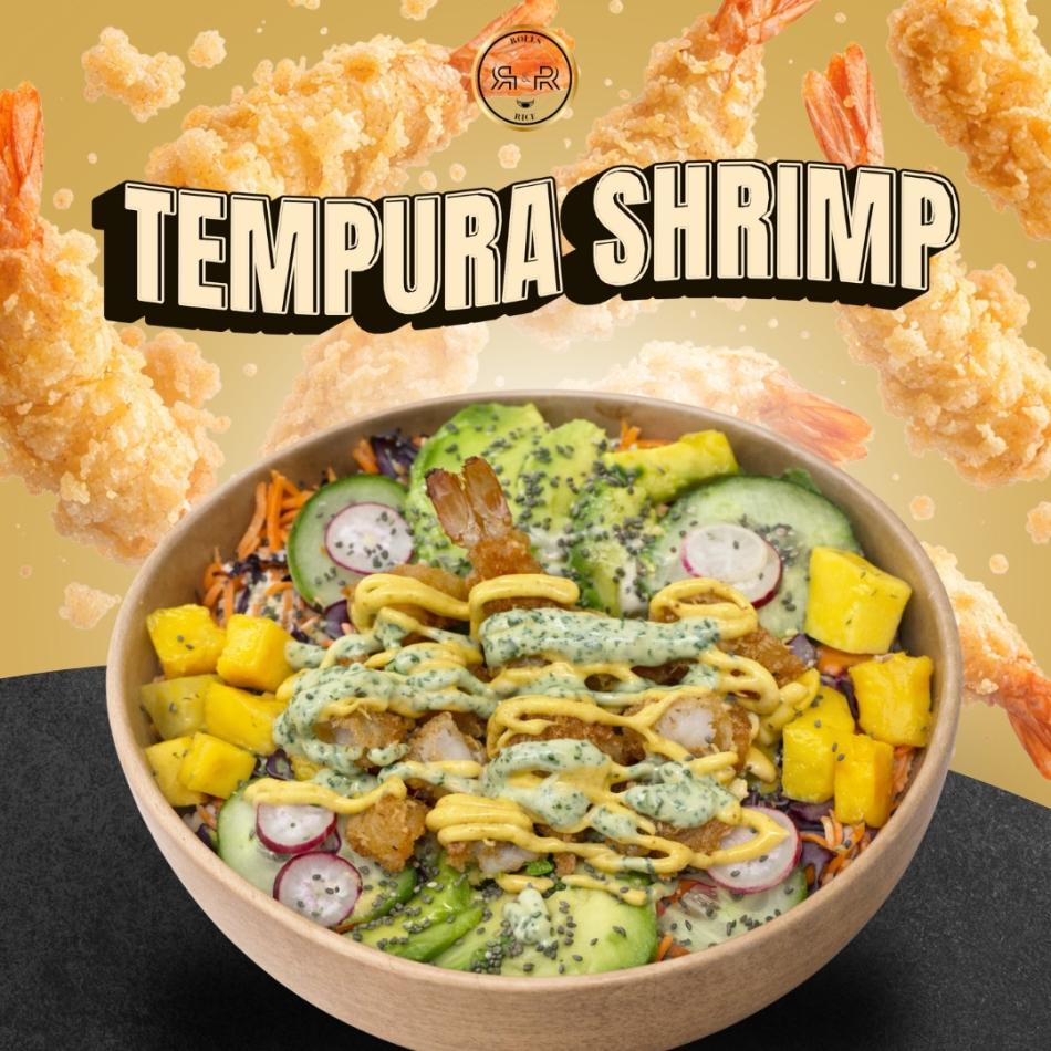 Riz parfumé, sauce blanche au yaourt grec , carotte, concombre, choux rouge, radis, tempura shrimp, sauce persil ail et curry mangue, mangue.