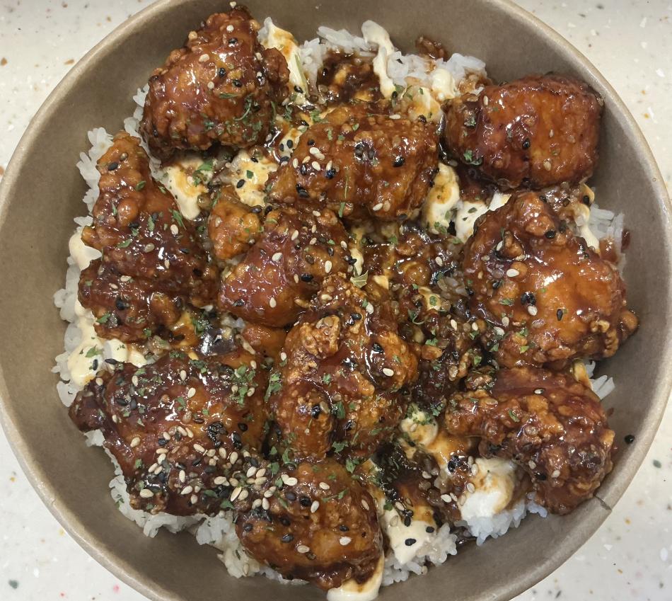 Fragrant rice, homemade sweet and sour sauce, two meats.