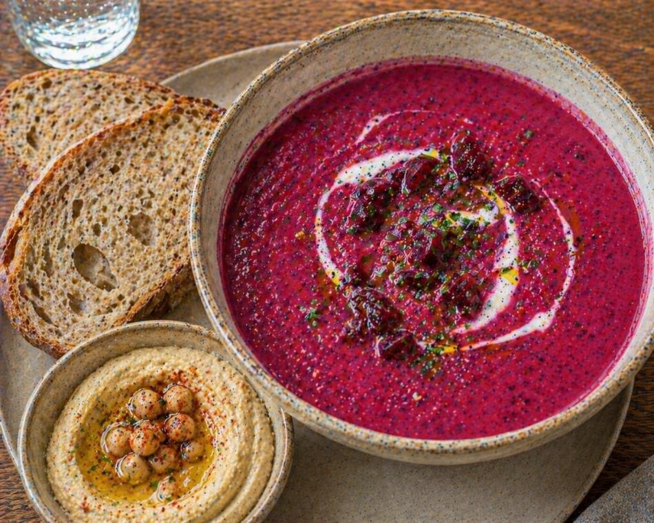 Tagessuppe -Cremige Rote-Bete-Kartoffel-Suppe, serviert mit Brot und Hummus