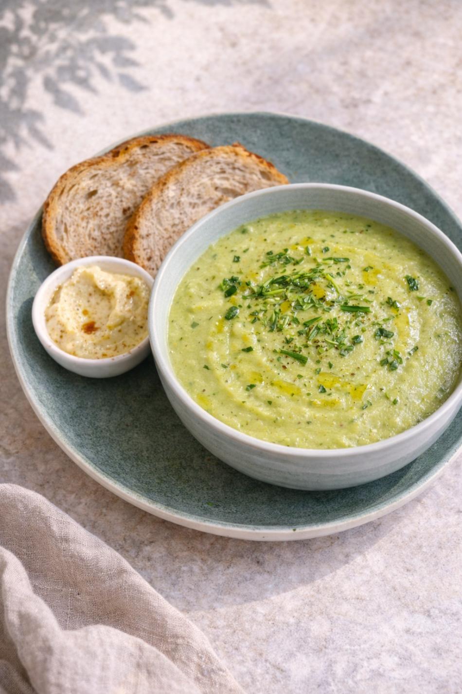 Tagessuppe – Cremige Zucchinisuppe, serviert mit Brot und Hummus