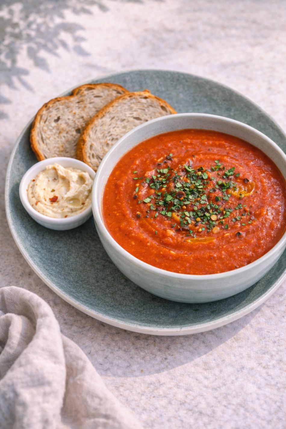 Tagessuppe – Rote-Paprika-Tomaten-Suppe, serviert mit Brot und Hummus