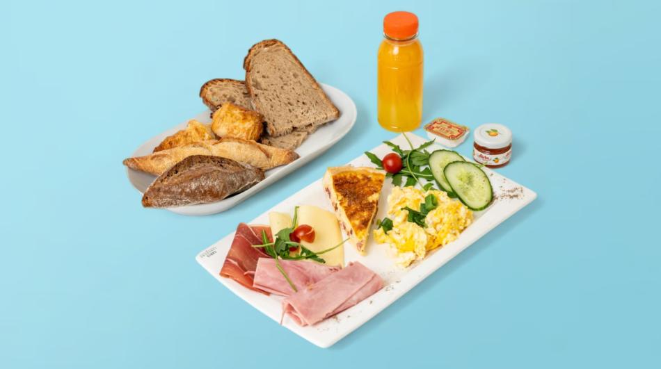 Oeufs brouillés, portion de quiches salées, 2x tranches de pain de froment, 1x petit pain, 1x petit pain spécial, 2x tranches de jambon, 2x de tranches de fromage gouda, 1x tranche de serrano, 2x mini viennoiseries ou 1 croissants taille normale, jus d'orange pressé, confiture et beurre,cafe