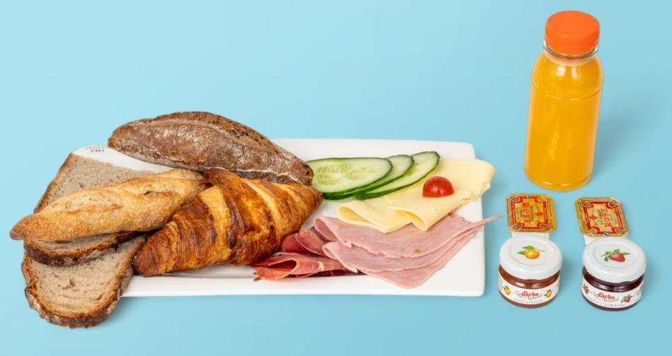 2 Scheiben Schinken, 2 Scheiben Käse, 2 Scheiben Serrano-Schinken, Croissant, 2 Scheiben Vollkornbrot, 1 Brötchen, 1 Spezialbrötchen, frisch gepresster Orangensaft, Marmelade und Butter, Kaffee