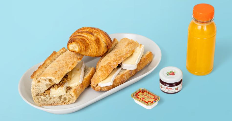 Buttercroissant mit Marmelade und frisch gepresstem Orangensaft. Baguettes mit Brie, Walnüssen und Honig