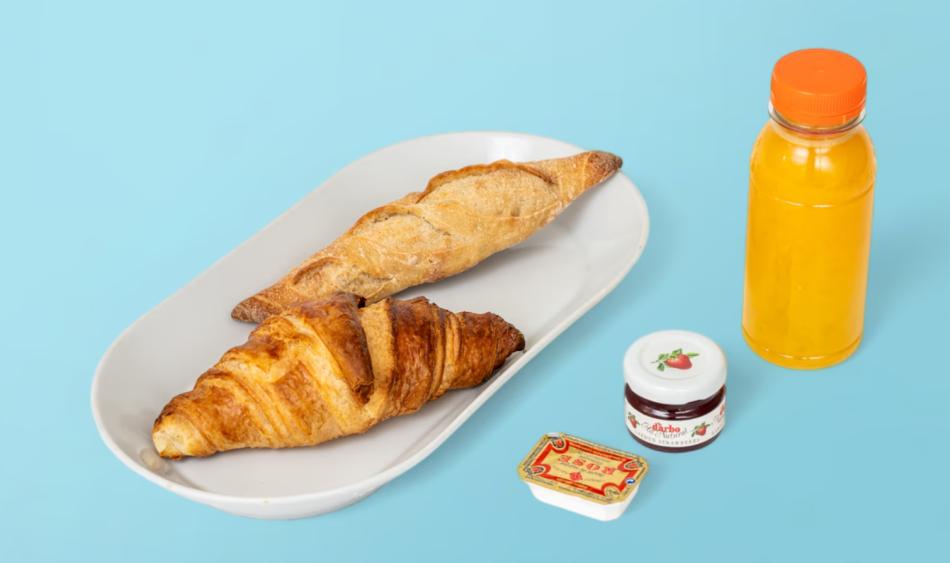 Small bread roll with jam and butter, croissant with butter and freshly squeezed orange juice