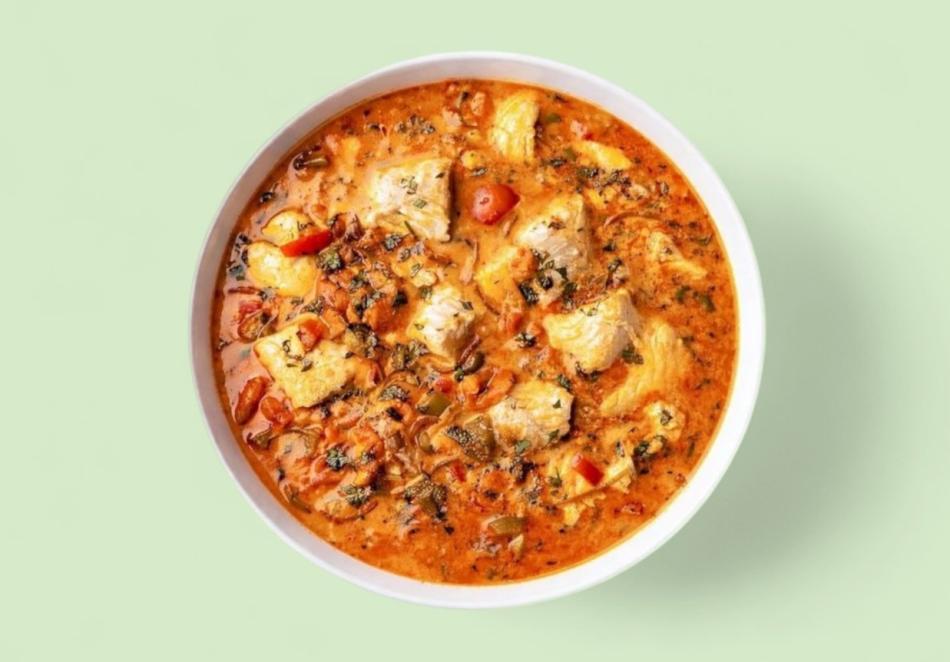 Brasilianische Fischsuppe mit Kokosmilch, Tomaten, Paprika, Zwiebeln, Knoblauch, Limettensaft, frischem Koriander und milder Chili.