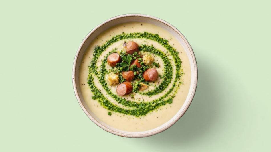 Pomme de terre, crème, poireaux, oignons, bouillon de légumes, saucisse viennoise