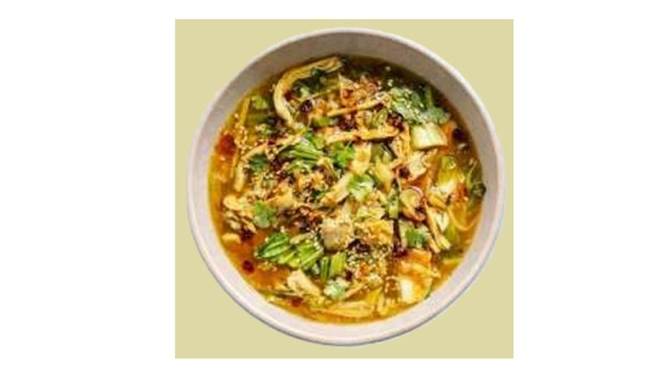 Knoblauch, Hähnchen, Pak Choi, Zwiebeln, Hühnerbrühe, Sojasauce, Reisessig, Kurkuma, Limette, Sesamöl, Koriander