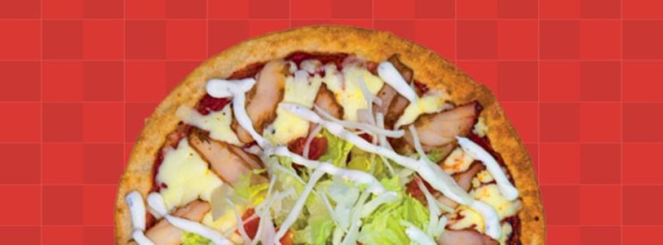 Tomatensauce, Tomate, rote Zwiebel, Halal-Hähnchen nach Kebab-Art, Salat, weiße Sauce, Mozzarella