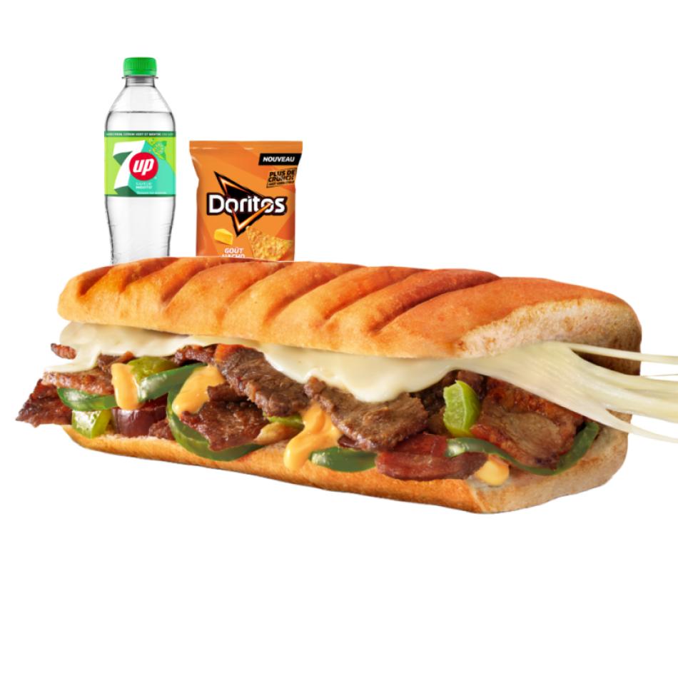 Cheesy & Grilled Sub: Gekochtes Rindfleisch in Scheiben, Mozzarella und die doppelte Portion amerikanischer Käse, Southwest-Sauce, karamellisierte Zwiebeln und Paprika. Die Inspiration des Ultra Cheesy Chef.