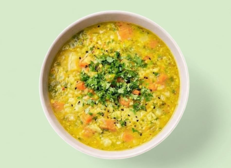 Apfel, Knoblauch, Karotten, Sellerie, rote Linsen, Zwiebel, Blumenkohl, Gemüsebrühe, Garam Masala, Kurkuma, Kokosmilch