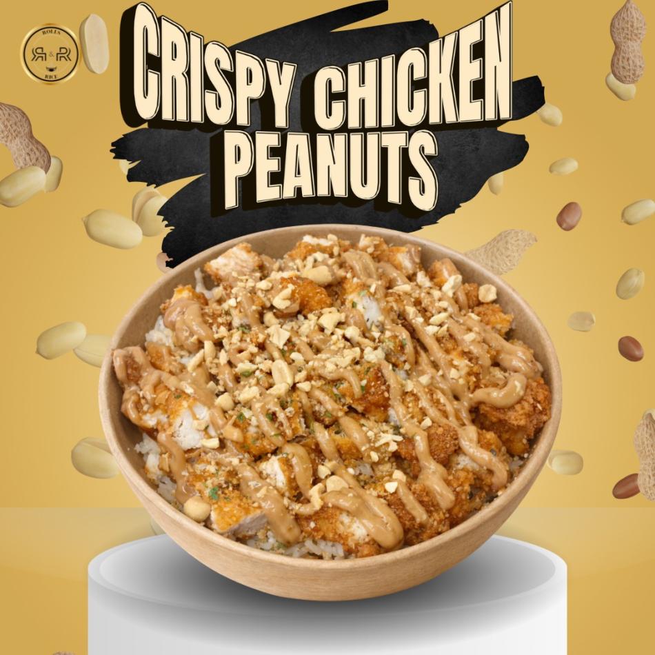 Duftreis, süß-saure Soße, knuspriges Hähnchen, Erdnussbuttersoße, Röstzwiebeln, Erdnüsse