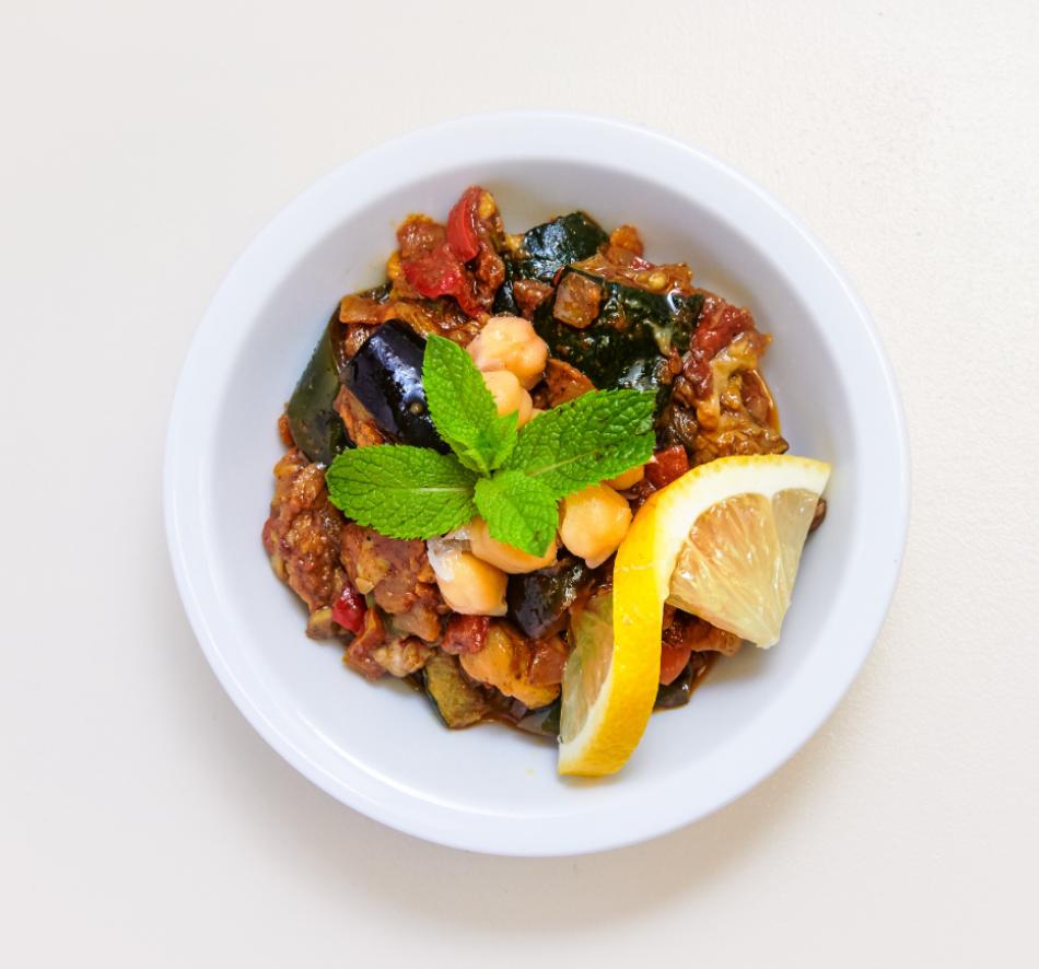 Aubergine, Tomate, Kichererbsen, Zwiebel, Tomatenmark