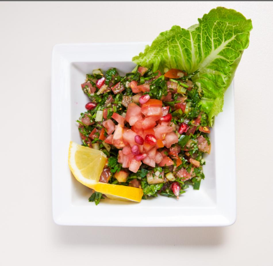 Petersilie, Tomate, Zwiebel, Zitrone, Olivenöl, Grieß, Granatapfel
