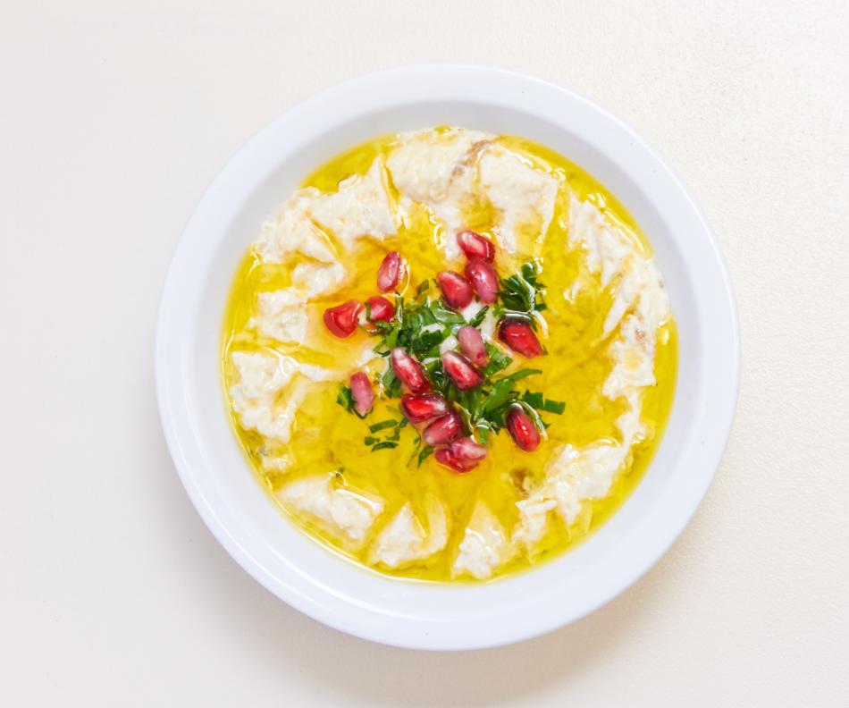 Gegrillte Aubergine, Knoblauch, Tahini, Zitronensaft, Garnitur, Olivenöl