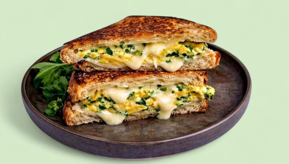 Sauerteigbrot, Eier, Zwiebeln, Kräuter, Comté-Käse, Mozzarella