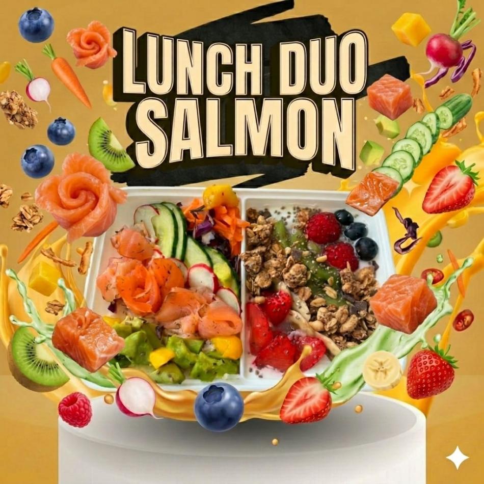 Duftreis, weiße Soße mit griechischem Joghurt, Karotten, Gurken, Rotkohl, Radieschen, Räucherlachs, griechischem Joghurt, Müsli und Früchten. Allergene: Gluten, Soja, Fisch, Milch, Sesam, Sulfite, Nüsse