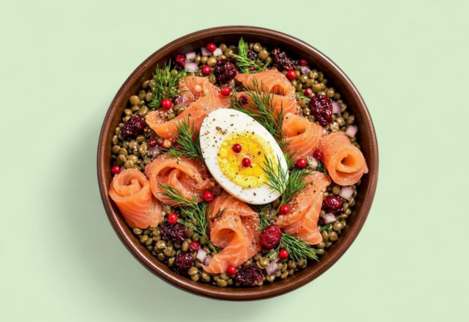 Linsensalat mit Räucherlachs und gekochtem Ei