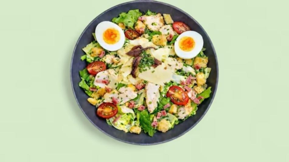 Frischer Salat mit Kirschtomaten, Ei, Croutons, Hühnchen, Sardellen, Parmesan, Bacon und Caesar-Dressing.