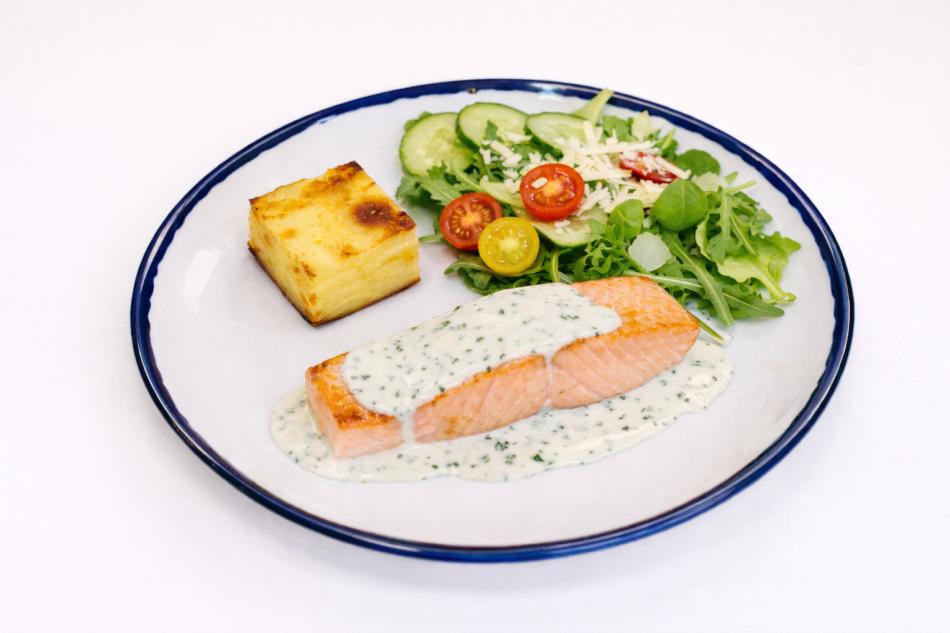 Gebratener Lachs, Kartoffel-Millefeuille, cremige Kräuter-Vinaigrette, frischer Salat
