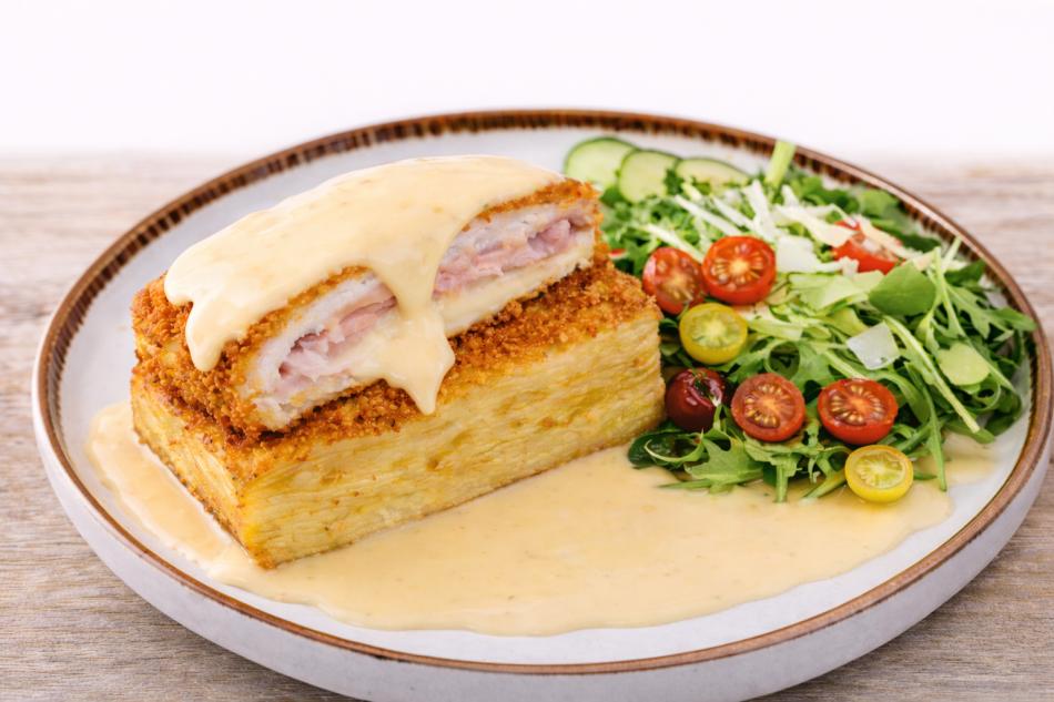 Paniertes Hähnchen-Cordon-Bleu (±150 g), Kartoffel-Millefeuille (±130 g), cremige Käsesauce, frischer Salat