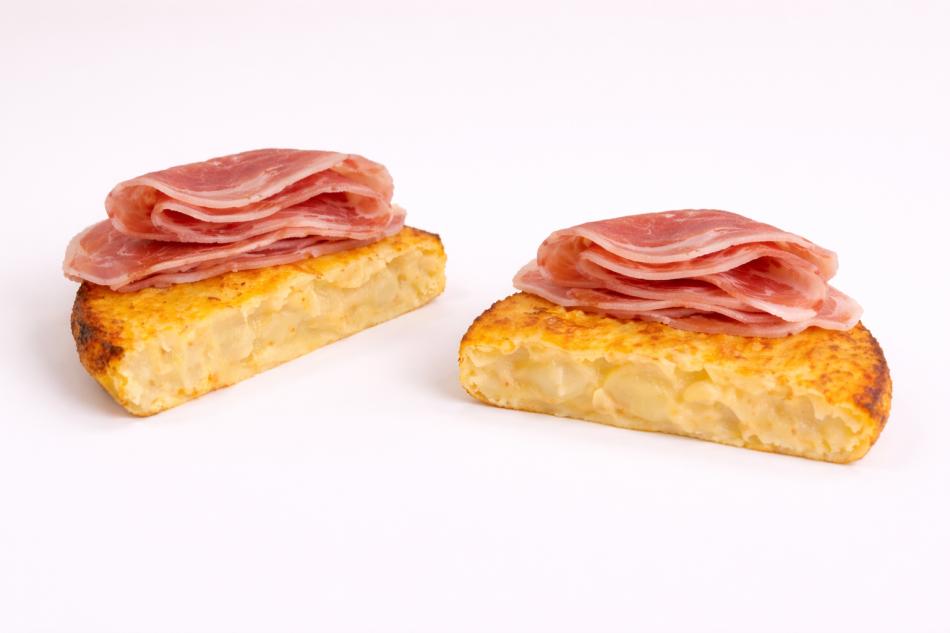 Traditionelle spanische Tortilla aus Kartoffeln, Eiern und karamellisierten Zwiebeln, in mundgerechte Stücke geschnitten und mit feinem Serrano-Schinken verfeinert.