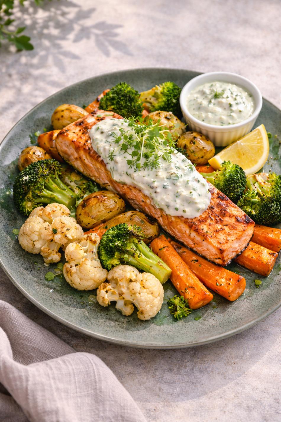 Serviert mit Ofenkartoffeln, Brokkoli, Blumenkohl und Karotten